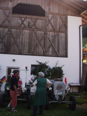 Unsere Fahrzeuge in der Abendsonne eingeparkt und selbstverständlich von unserer lieben Frau Braunhofer begutachtet, wobei sie sofort auf Flo´s Hela stieg, der ihr auf Anhieb ins Auge stach und sie diesen Schlepper gerne auf Ihrem Hof hätte.