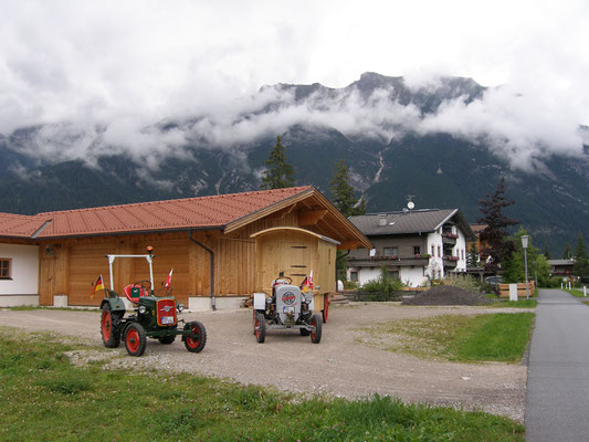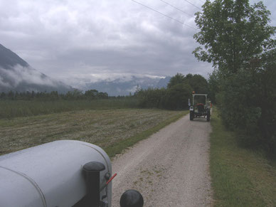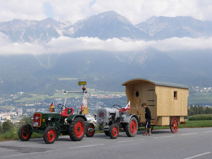 Mit 12 und 16 PS, Florians Hela, Baujahr 1958 mit 12 PS, unser Eicher Baujahr 1952 mit 16 PS, über den Brenner war unser Ziel am 31. Juli 2007.