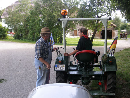 Frau Braunhofer hätte nie gedacht, dass wir mit unseren alten Traktoren Sie besuchen würden. Wir hatten an Ostern unsere Pläne Ihr anvertraut, und meinte, als Florian vorgefahren war, es würden 2 Motorräder parken, doch bei genauerem Hinsehen hätte Sie dann Florian erkannt und war dann überrascht als auch ich noch mit meinem Eicherle und unserem Wendelin auftauchte.