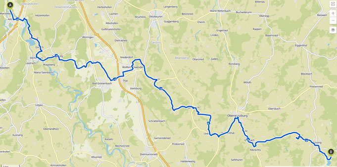Albrecht hat mir die Weiterfahrt ab der Mühle abgeraten, da dieser Weg nur schwer mit unserem Wendelin zu bewältigen wäre. Kurzum habe ich dann den Weg über Wolfertschwenden, hier ein langer und