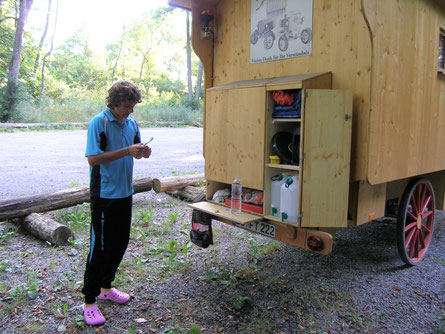Neben unserem Gespann hat sich ein junges Pärchen platziert, das einen Bus notdürftig vorerst ausgebaut hatten, um das Campingleben zu erfahren.