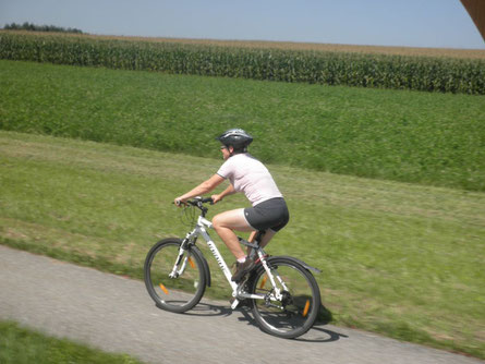 Franziska bei mir auf dem Traktor oder im Schäferwagen, Elfi sportlich mit dem Fahrrad.