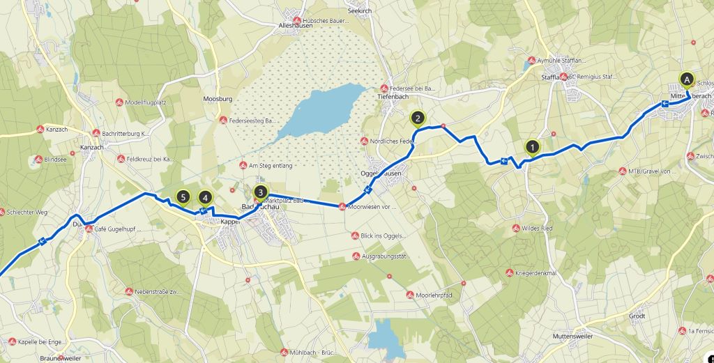 Zunächst Richtung Oberdorf und weiter über Eichen nach Oggelshausen.